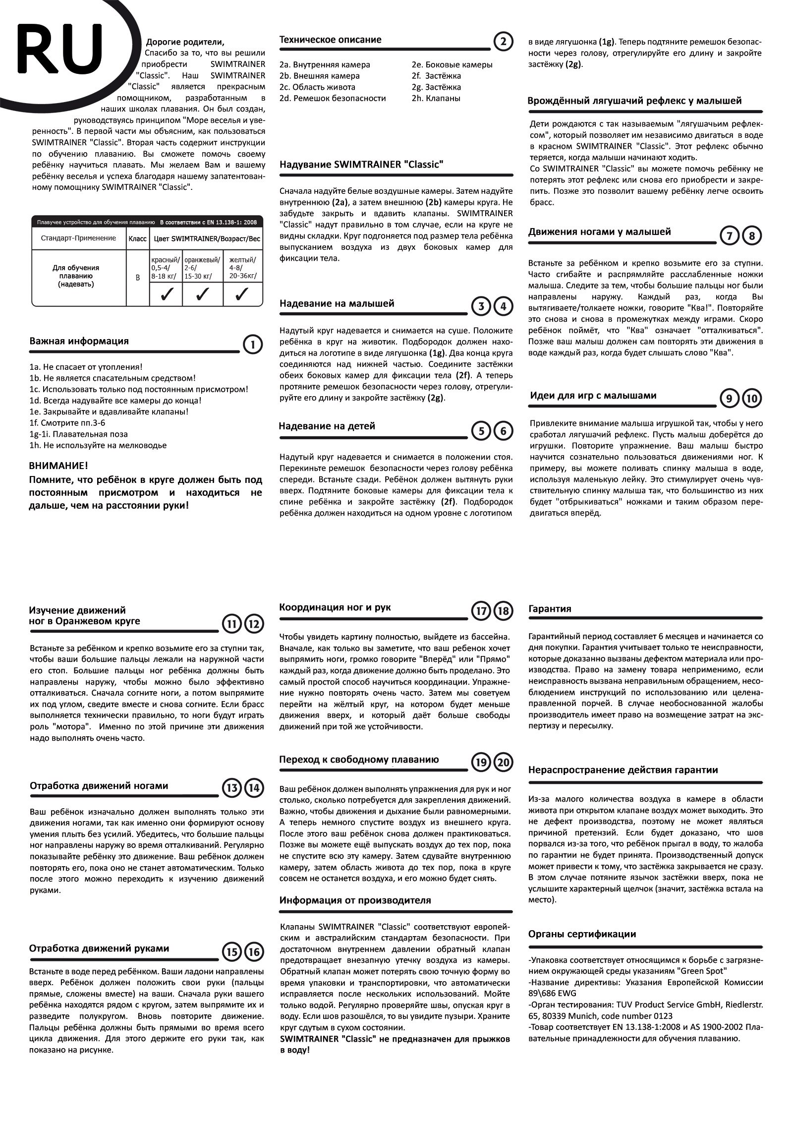 Внутри каждой коробочки с кругом SWIMTRANER (25х20х5 см, 0.5. кг) находится подробная инструкция на всех европейских языках, включая русский. В ней, помимо требований безопасности, вы найдёте иллюстрированные описания готовых упражнений, а также идеи для самостоятельного воплощения. Это позволит вам чрезвычайно безопасно, весело и с пользой проводить время с ребёнком в бассейне, озере или море. Вы можете начать даже с простой ванны (не забывайте придерживать ножки, чтобы малыш лежал на воде, а не вставал в ванне)! Мы знаем, что это создаст основу для крепкой любви вашего малыша к воде на всю оставшуюся жизнь.